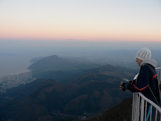 Okay, okay, you know what's coming. We strolled leisurely over to the cable-car building, which was completely closed and bereft of human life. We started to panic. The enormous 20-foot tall thermometer was reading zero degrees, and a light snow was falling, as if to mock us. There was nowhere that we could possibly spend the night at the top without freezing to death, so we had to act fast, and get down the mountain as quickly as we could while there was still a bit of twilight.